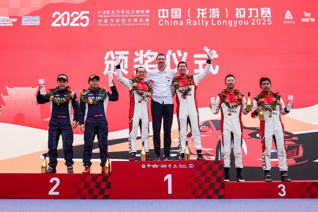 工人日报客户端10月27日电(记者刘兵)10月26日,2025年国际汽联亚太汽车拉力锦标赛-中国(龙游)拉力赛(以下简称APRC)暨2025年龙游·中国汽车拉力锦标赛(以下简称CRC)圆满落幕。斩获全场冠亚季军的车手分别是:一汽奥迪拉力车队林德伟/乐柯鹏,OSIAS天境车队的姚秀磊/陈远松,一汽奥迪拉力车队范高翔/韩啸。